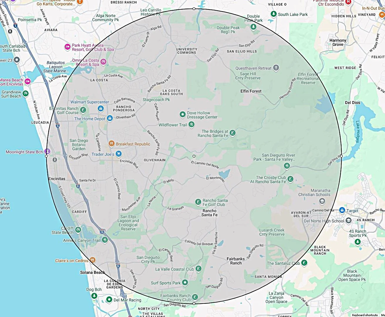 Travel fees are based on distance from my home base in Rancho Santa Fe, California, and are detailed below. Standard travel includes homes, offices, and public meeting places within North County, San Diego. Please note: appointments at jails, hospitals, or nursing facilities are not included in the listed travel fees. Contact me for a quote.